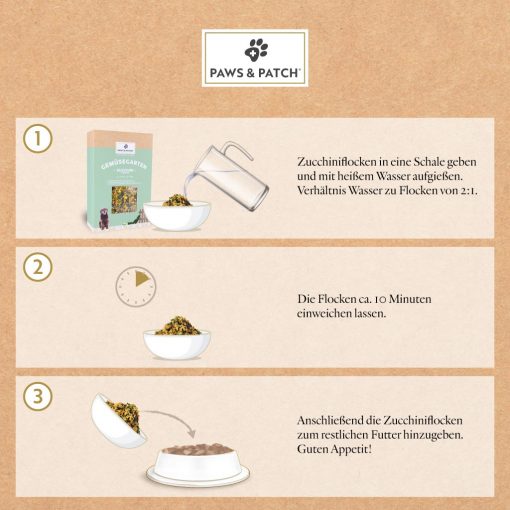 Die getrockneten Zucchiniflocken von PAWS&PATCH sind eine ideale Beilage zu selbstgekochtem Futter, BARF-Rationen oder zur Schonkost. Die Zucchiniflocken finden auch als Ergänzung von Trocken- oder Nassfutter Anwendung. Durch den hohen Vitamin- und Mineralstoffgehalt ist die Zucchini eine gern verwendete Gemüsebeilage. Die Zucchiniflocken sind leicht verträglich und kalorienarm.